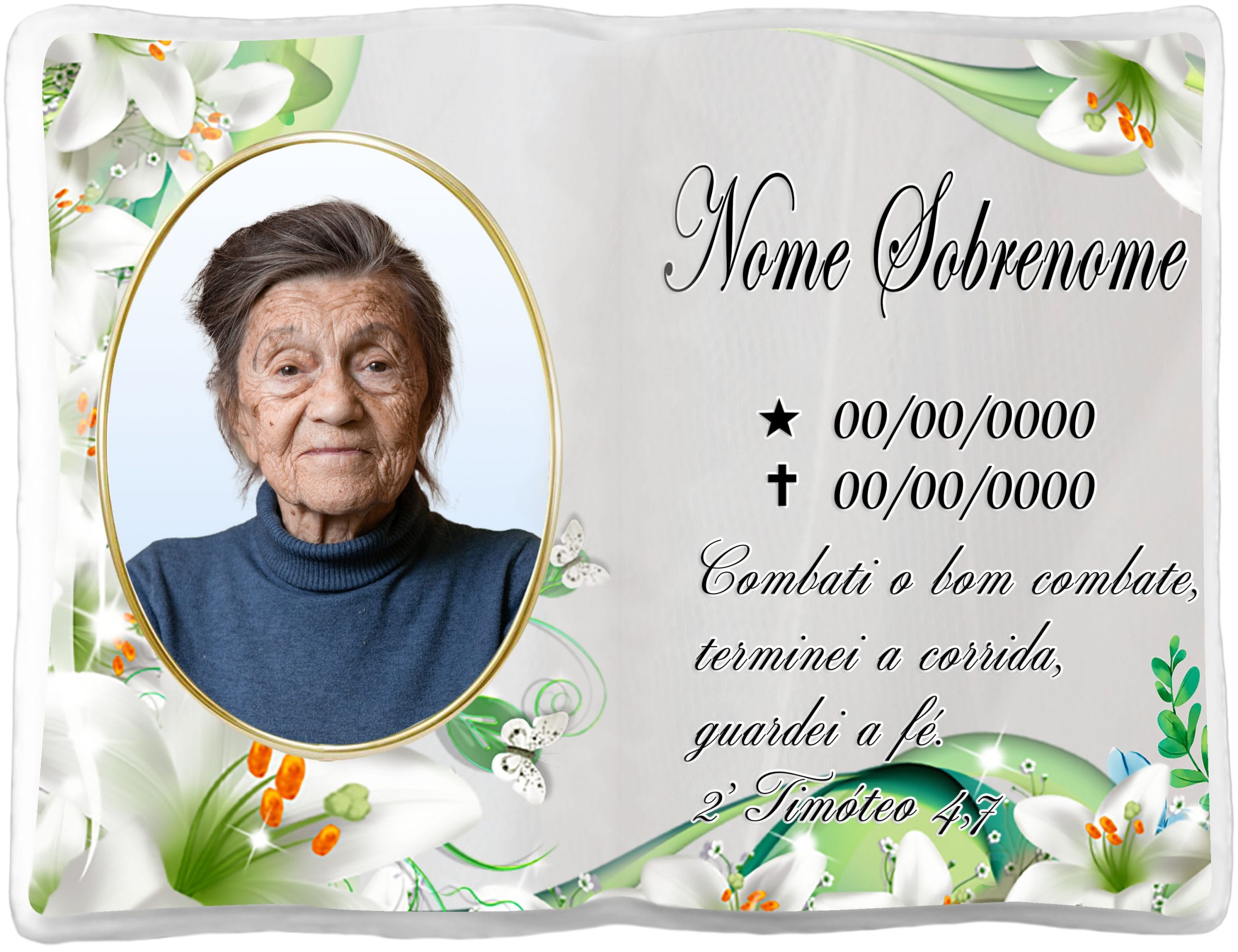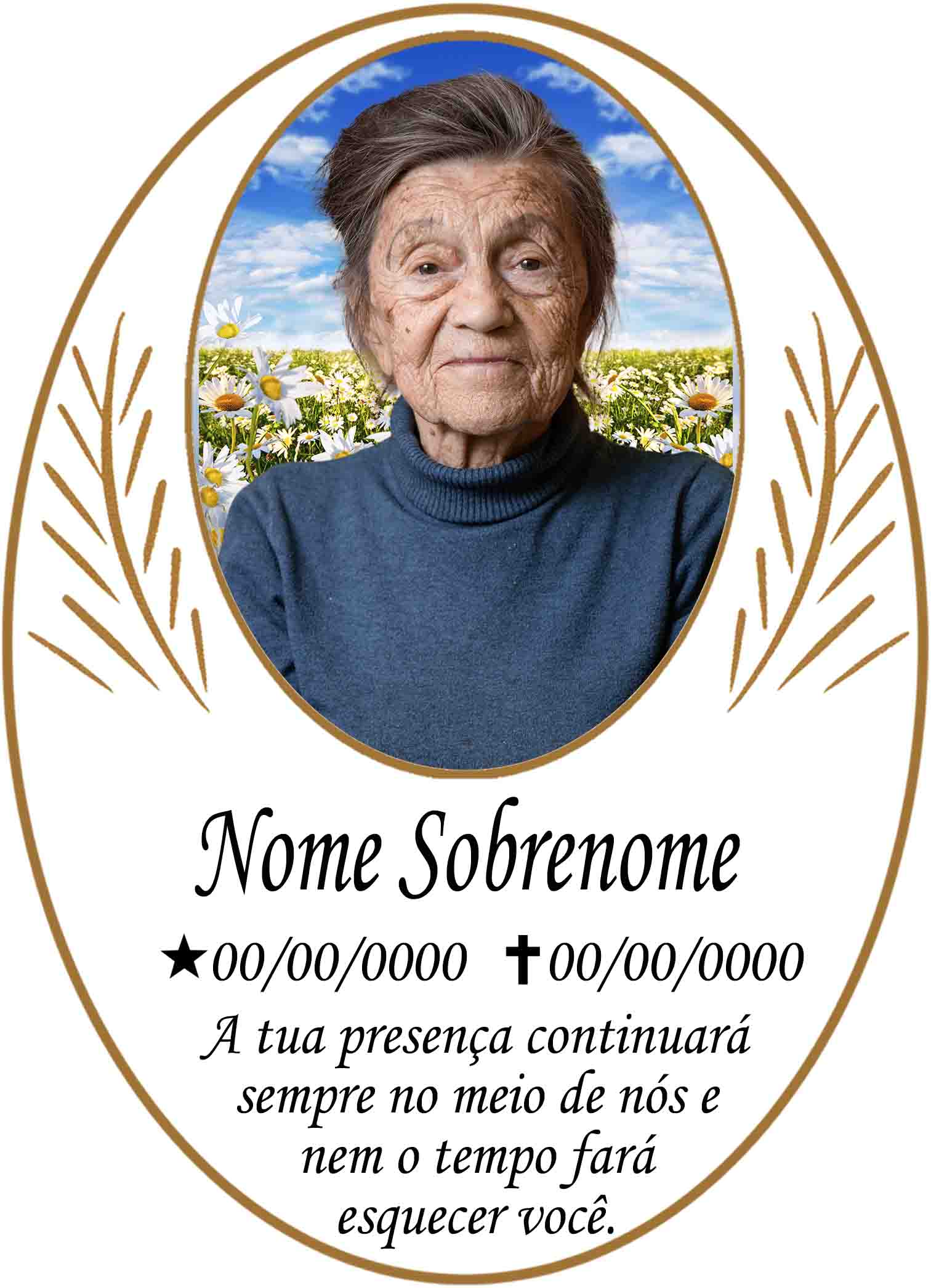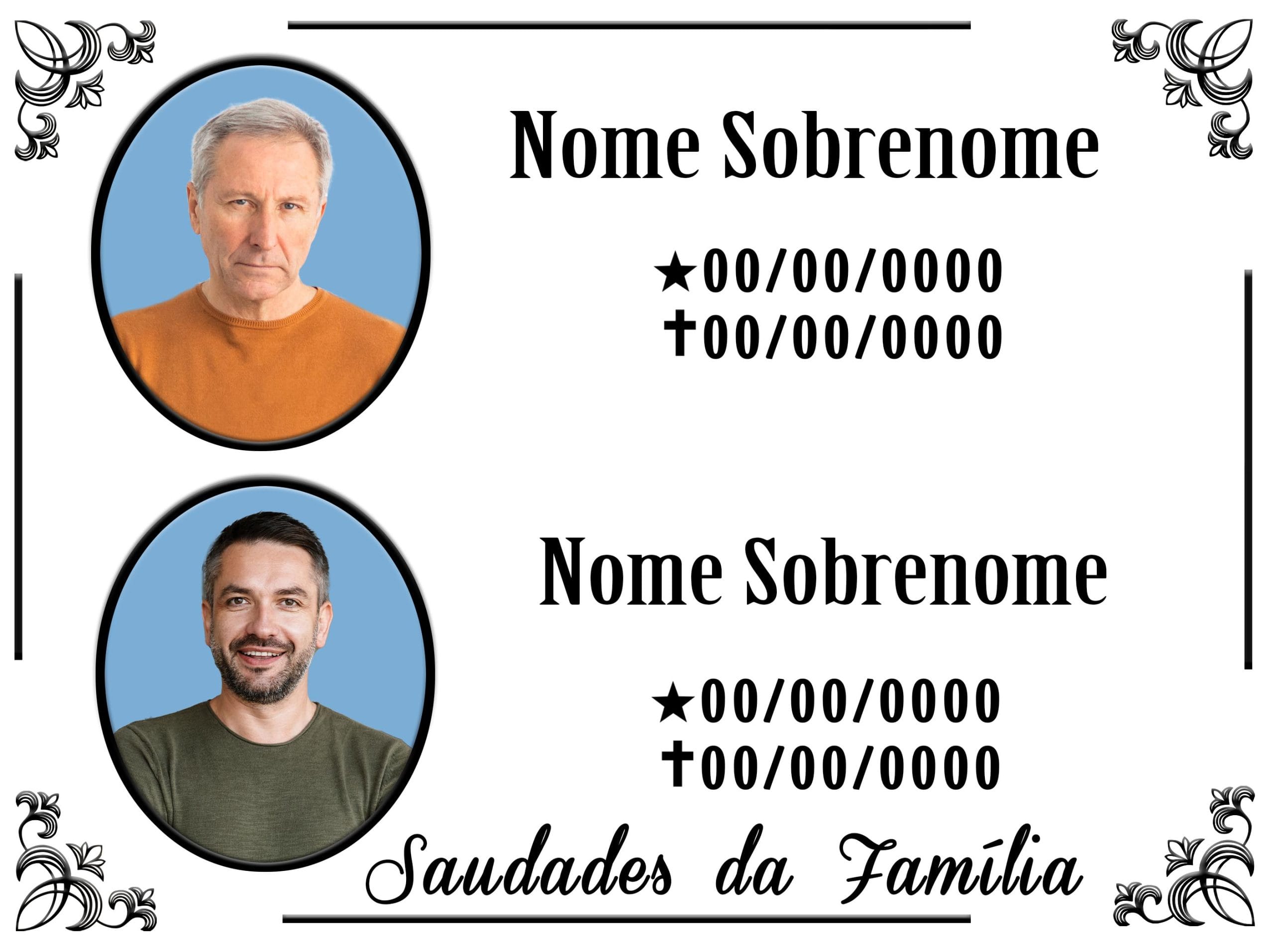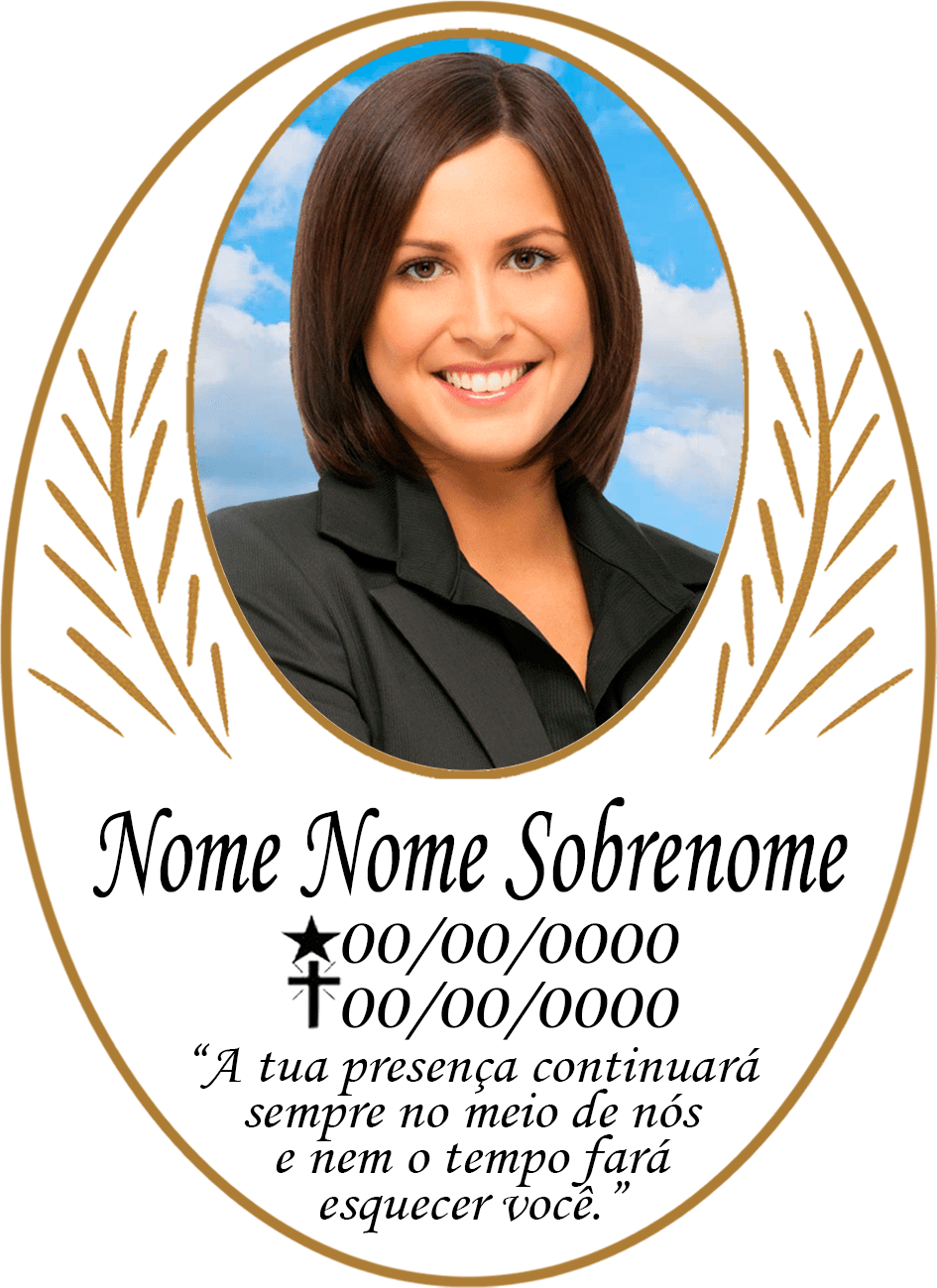 Depois de definir o modelo, basta nos enviar a foto, nome e sobrenome, datas de nascimento e falecimento, além de uma frase ou mensagem de homenagem. Você pode escolher um dos nossos modelos ou criar o seu próprio texto. Após isso, enviaremos uma amostra virtual para sua aprovação.